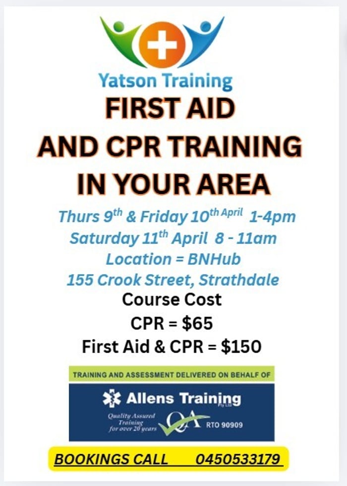 Allens Training will be delivering a CPR and/or First Aid course from our site. This is a great opportunity to learn First Aid (or update your qualifications).