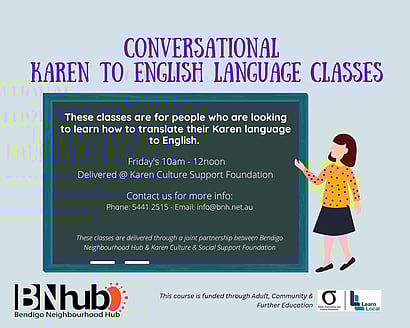 English Language ClassesThis class is for Karen speaking people who are interested in building their English language skills. This free course runs Friday mornings in Sailors Gully.