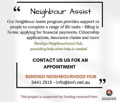 Bendigo Neighbourhood Hub brings people together to connect, learn and contribute to our local Bendigo community through providing a range of ever changing social, educational, recreational and support activities.