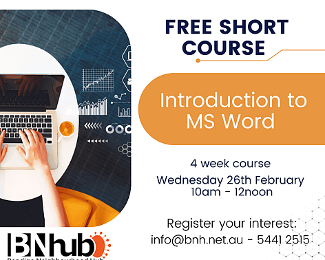 Intro to MS WordThis course is ideal for people looking for work (a program commonly used in most workplaces), people wanting to refresh their skills or if you already have MS Office on your computer. The course is FREE and includes a learner workbook.